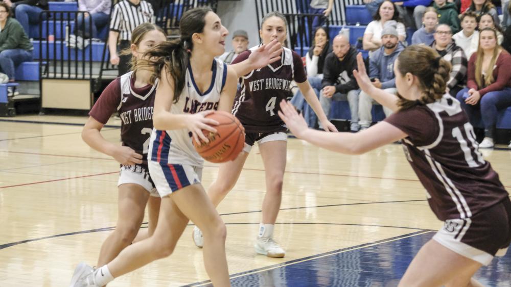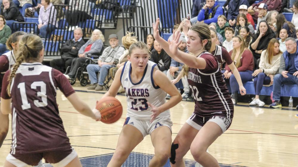 Elyza Wagner battles for the ball near the opponent's hoop. The game was mostly neck and neck throughout the first half, but the Lakers left West Bridgewater behind as the game played out.