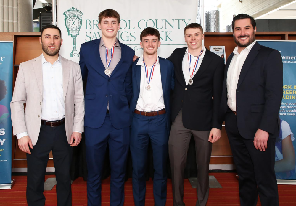 Apponequet High School also took second place. From left: Michael Patacao, Senior Vice President, Commercial Lending Market Manager, Bristol County Savings Bank and Board Chair, JA of Southern Massachusetts; students Colin Cyr, Rowan Jensen and Colton Smith; and Jeffrey Pelletier, President and CEO, JA of Southern Massachusetts.