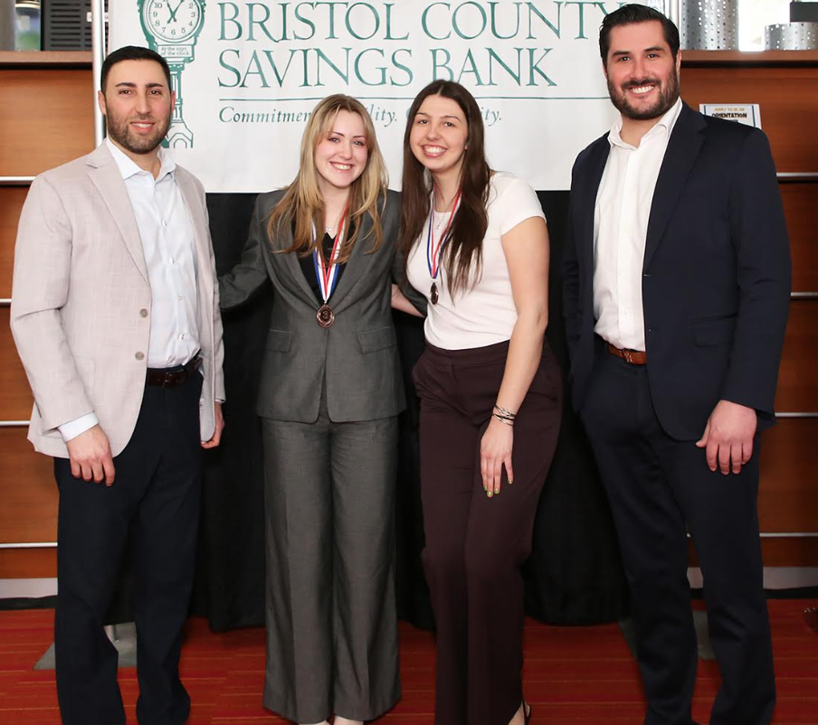 Apponequet High School also took third. From left: Michael Patacao, Senior Vice President, Commercial Lending Market Manager, Bristol County Savings Bank and Board Chair, JA of Southern Massachusetts; students Fiona Boren and Elise Horton; and Jeffrey Pelletier, President and CEO, JA of Southern Massachusetts.