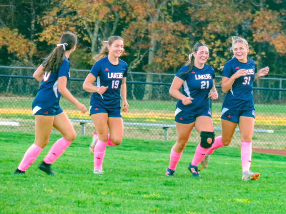Apponequet Regional High Schools girls soccer players celebrate after scoring a goal. Photos by Grace Roche