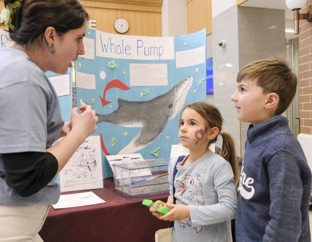 Volunteer Doria Gedraitis teaches Noah, 8, and Cozy Chiuppi, 6, about the important role whales play in the ocean ecosystem.
