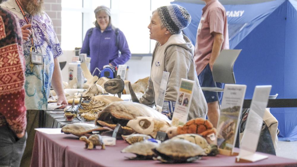 Founder and President of the New England Coastal Wildlife Association, Carol “Krill” Carson, speaks to attendees at the association's booth which brought plenty of up-close ocean knowledge to the fair.