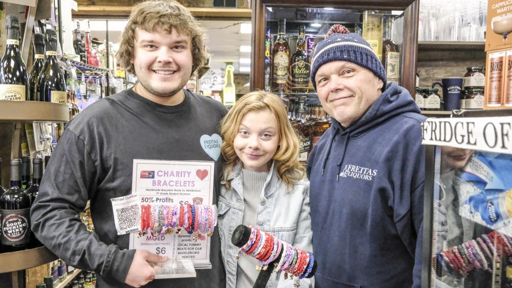 From left: employee Nick Freitas, Shyanne and owner of the store Tony Freitas pose at the liquor store. Tony Freitas said employees and customers alike have always been happy to support Shyanne's work.MIDDLEBORO — Bracelet by bracelet, a Middleboro teenager shows support for her community.