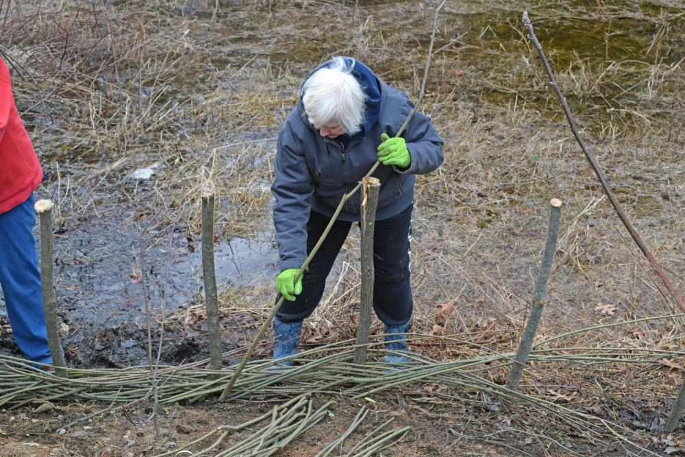 Volunteers weave willows to plant a living fence