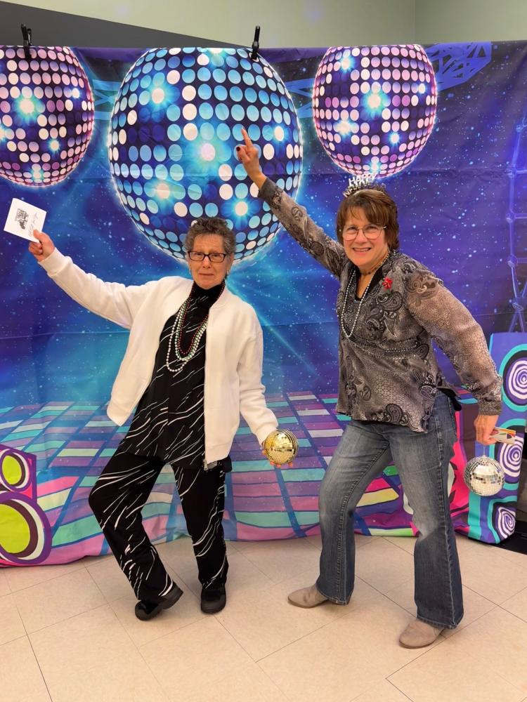 Prize winners Charlene Montleon and Rosemary Duclos. Prizes were awarded to the grooviest dressed attendees.