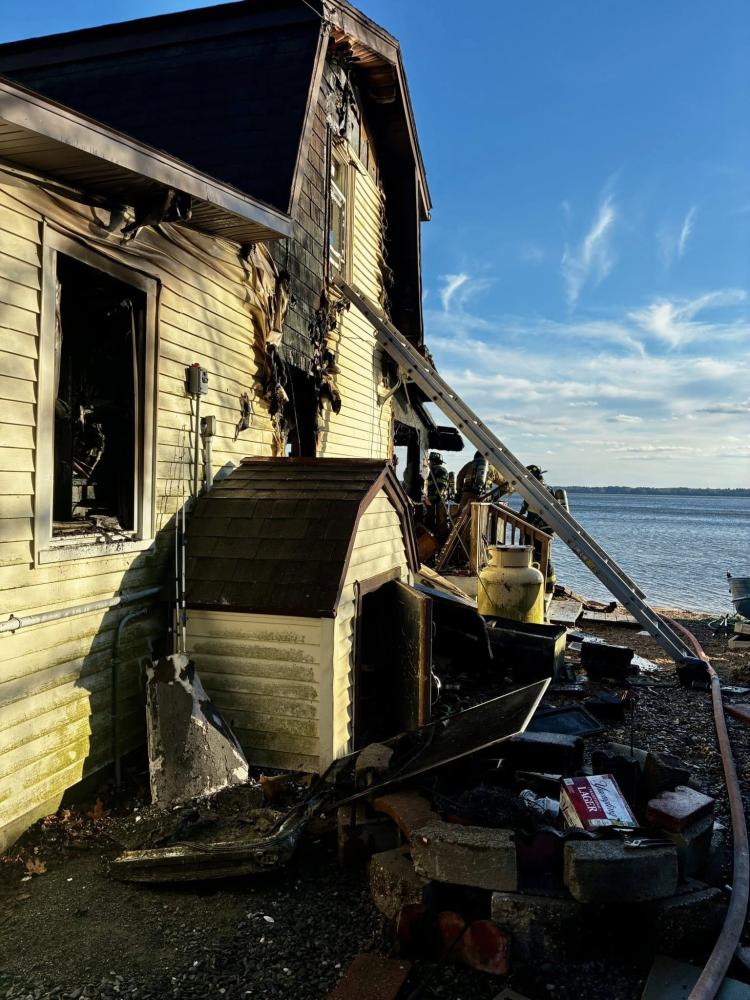 A portion of the lake-side home is charred. No injuries occurred during the fire or response.