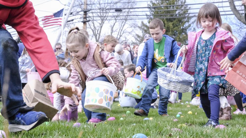 Children rush to fill their baskets full of Easter eggs. The Lions set up three areas based on age for the many egg hunters.