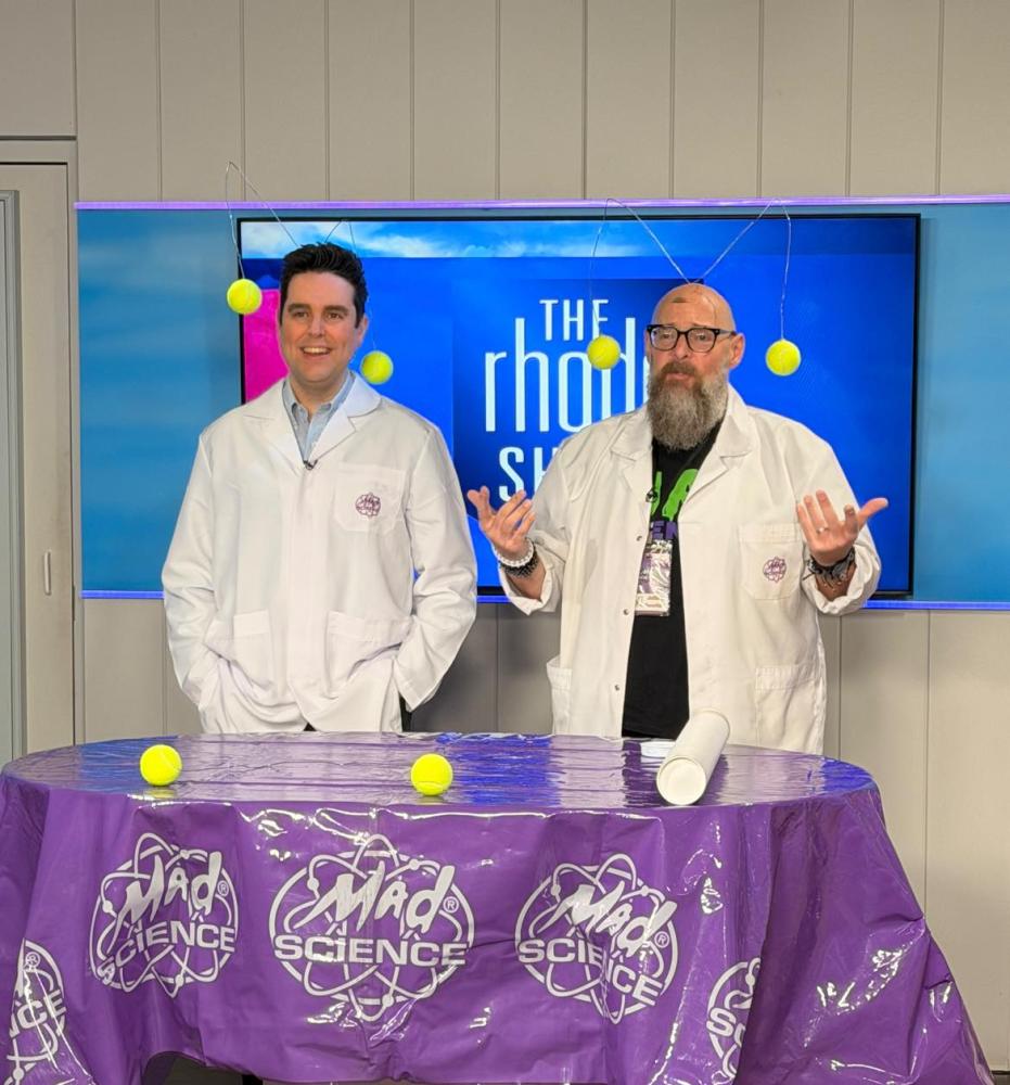 Breindel demonstrates the center of gravity with "Alien Antennae" with Brendan Kirby of The Rhode Show on WPRI 12 in Providence.