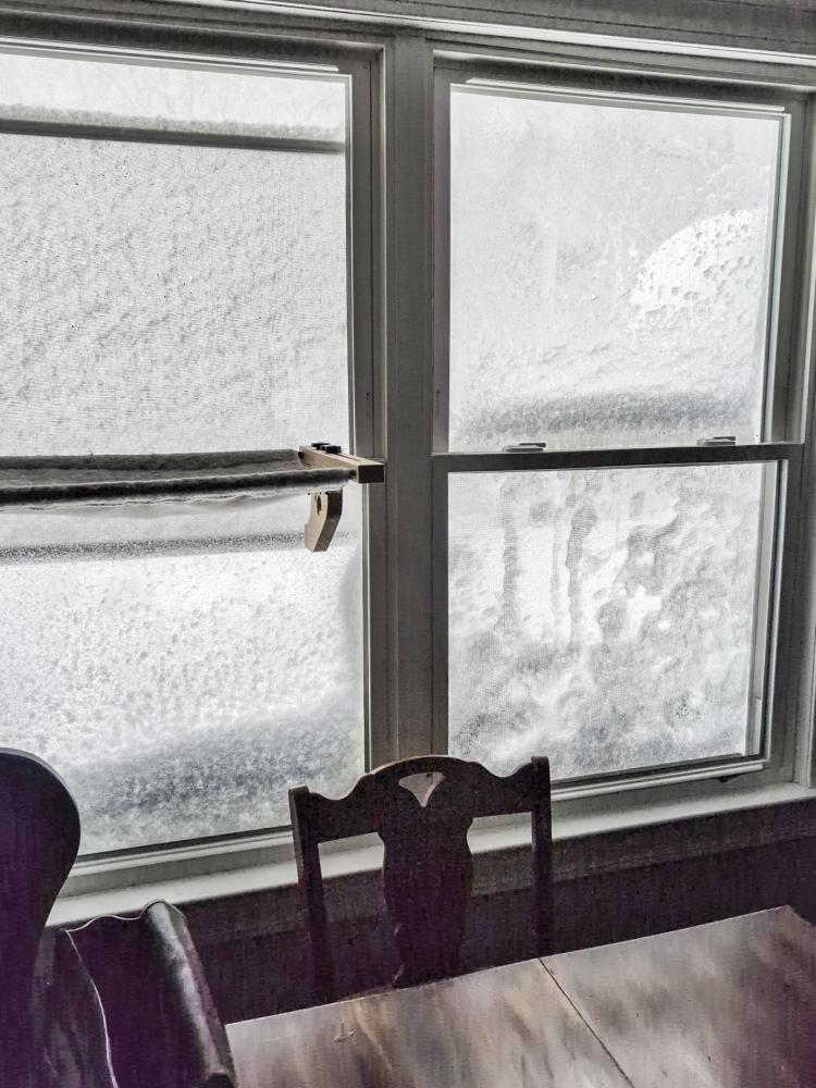 The view looking outside of a Lakeville home is met with a snow-covered window after high winds and wet snow conditions land in the area.LAKEVILLE — Residents are hunkering down as a blizzard roars through Lakeville.