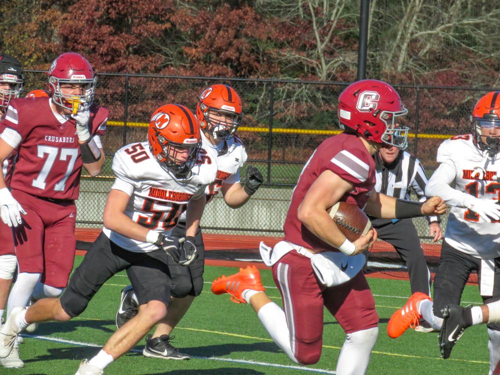 Wyatt Goyette makes a run with the ball. CARVER — Middleboro and Carver residents packed into the Carver High School football stands Thanksgiving morning for a yearly athletic tradition.