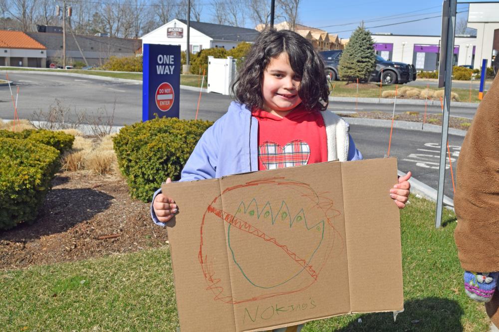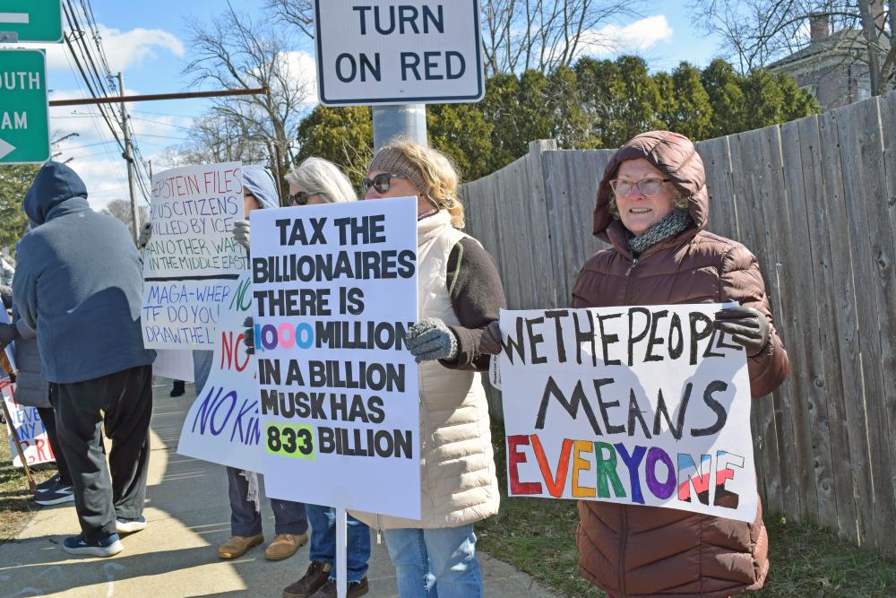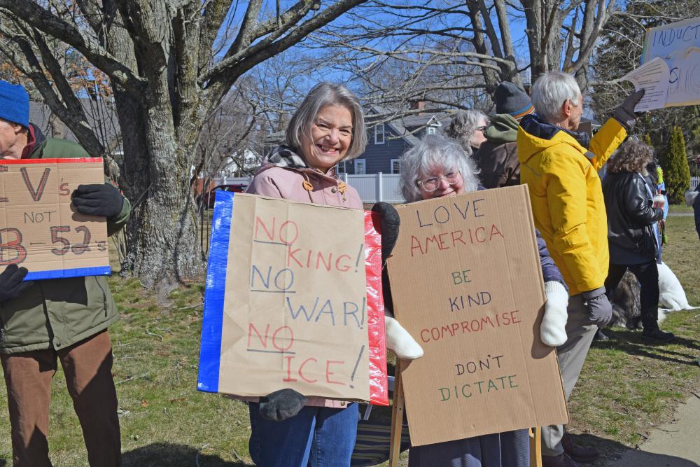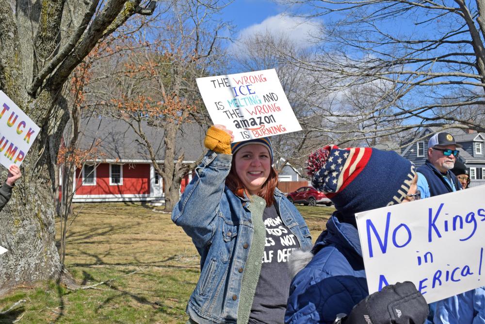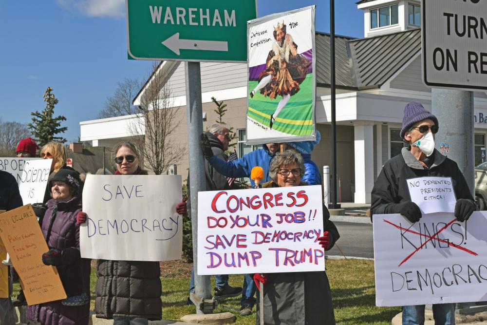 Three protesters show their signs. MIDDLEBORO— “This is what democracy looks like,” protesters chanted during a “No Kings” protest at the intersection of routes 28 and 105. This was one of the call-and-response chants that filled the air at the Saturday, March 28 demonstration.