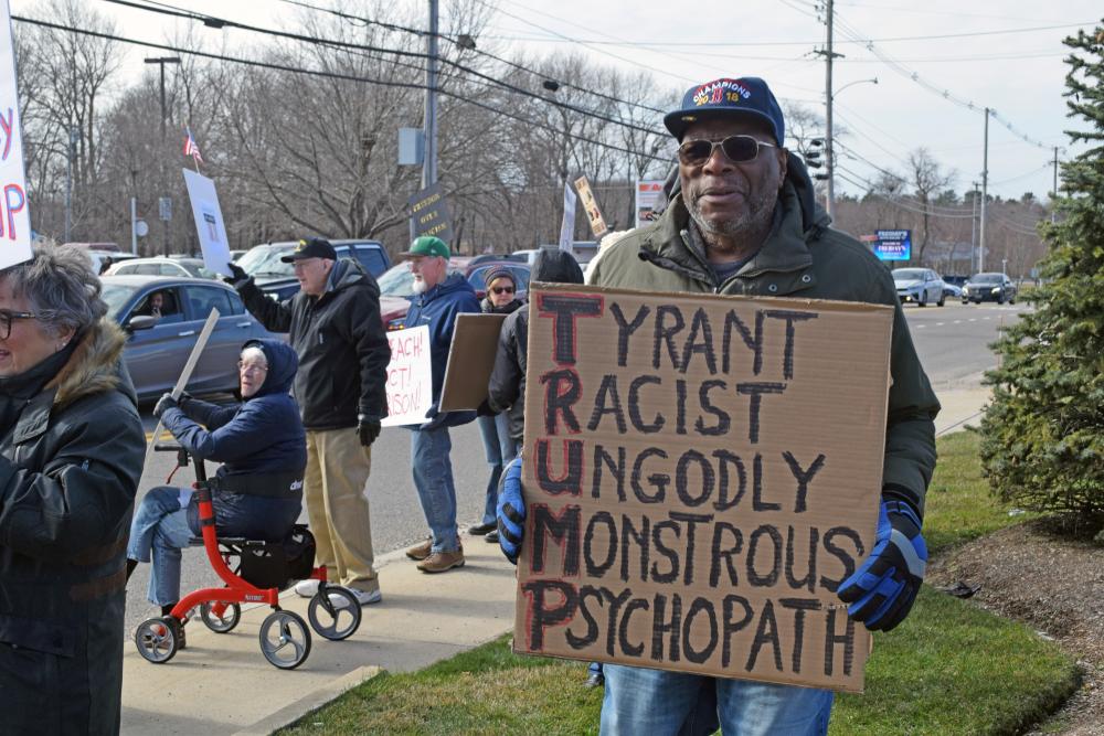 “I was a Marine Corps communication officer for about eight years, and then I was a Navy officer for 18 years. I’ve been to war zones and Donald Trump is a disgrace to our country,” Lakeville resident Kelley Newman said. “He’s using our military veterans as pawns.”