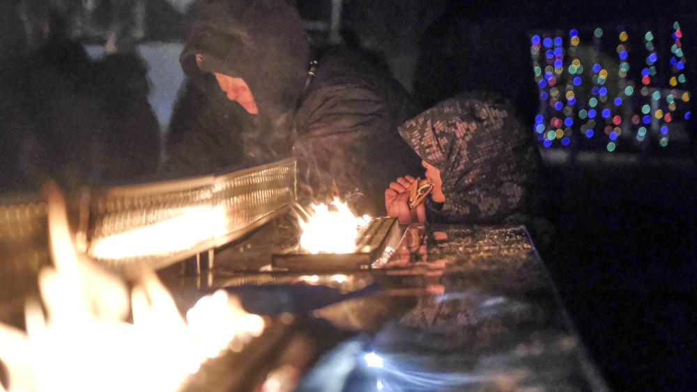 New Year's revelers surround the large bonfire that was fed with a pile of Christmas trees throughout the evening.