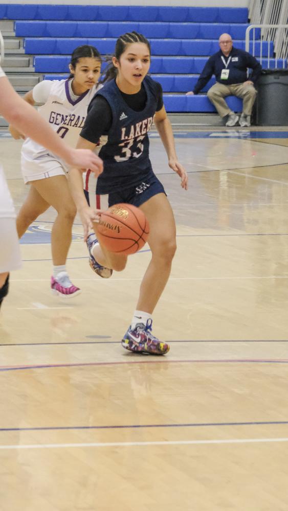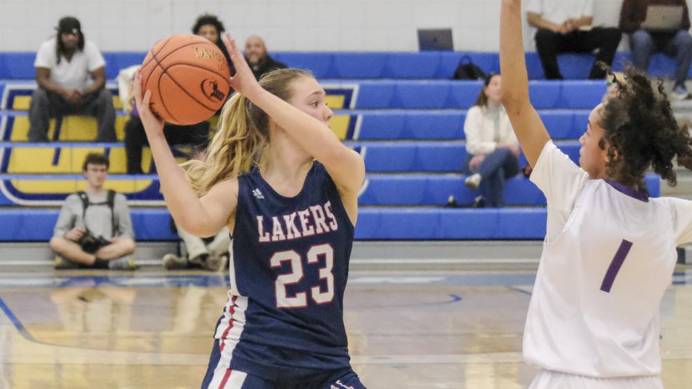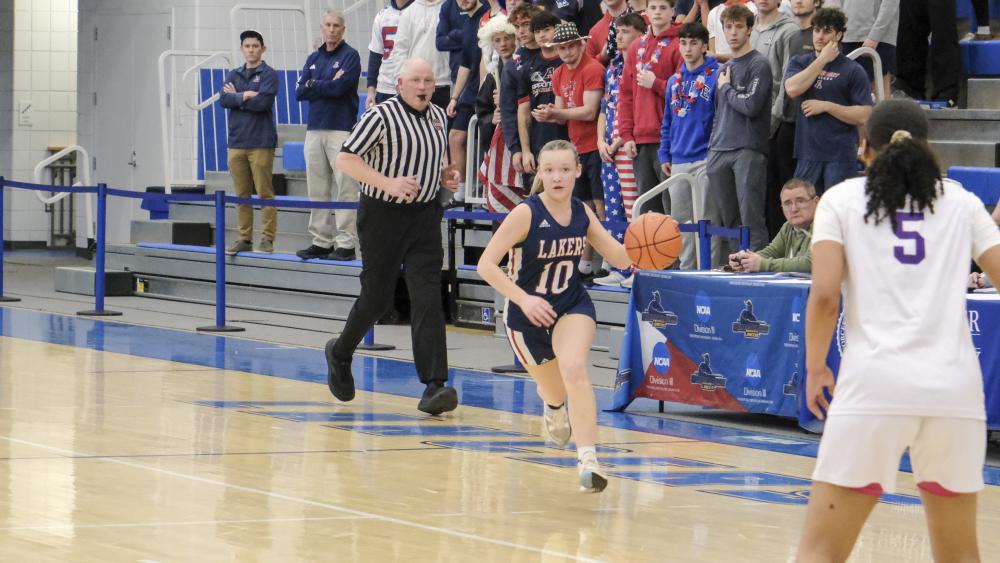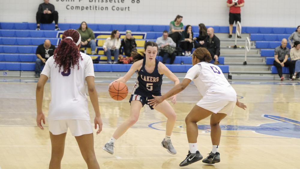 Lakers player Kyla Claro weaves through the defense. Head Coach Trevor Gagnier said the team handled the pressure well, but Pittsfield "snowballed" into the win in the later quarters.