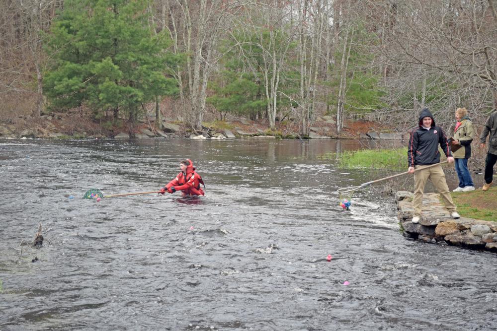A volunteer gets the duckies out of the stream.