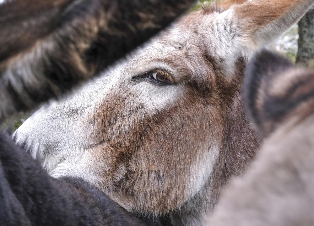 Star the donkey rests its chin on another at the Forever Farm animal sanctuary in Middleboro, Oct. 16. Photo by Sam Tucker
