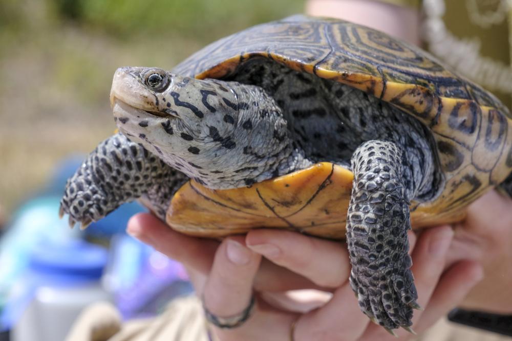 A volunteer from the New England Coastal Wildlife Alliance holds a female Diamondback Terrapin at Parkwood Beach in Wareham on Friday, June 27. The alliance is led by Middleboro resident Carol “Krill” Carson. Photo by Sam Tucker