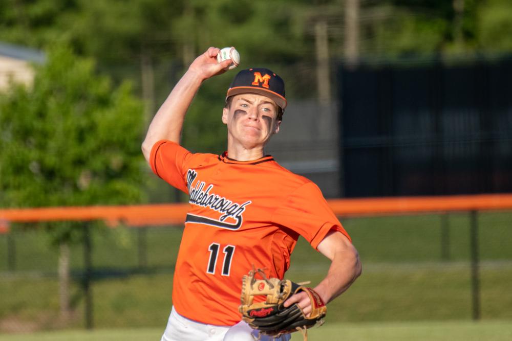 Middleboro Sachems starting pitcher Ryan Tullish delivers a pitch to a Grafton High School hitter at a June 3 game. Photo by Bobby Grady